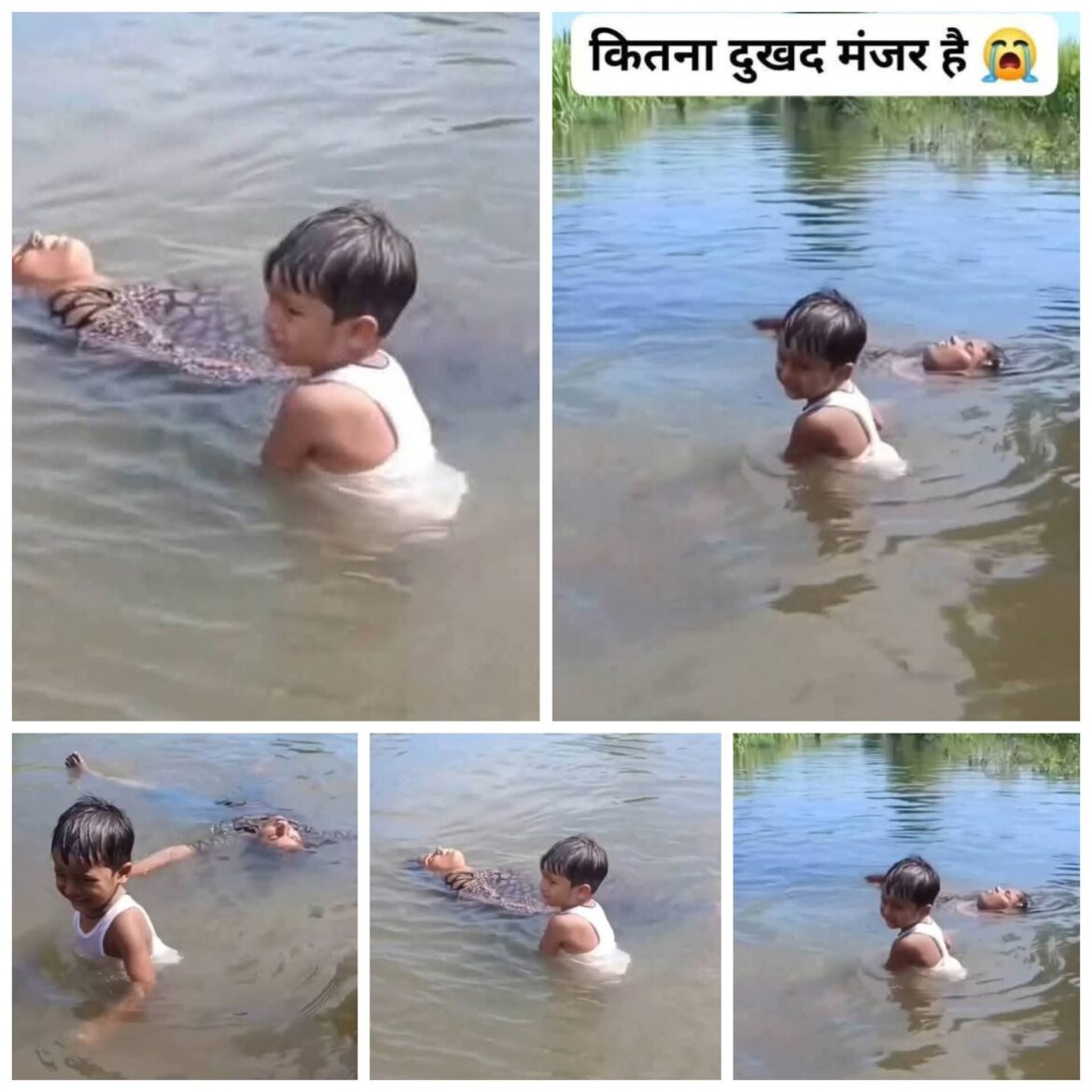 मां खुद डूब गई लेकिन अपने बच्चे को जीवन दान दे दिया। यह विचलित कर देने वाली तस्वीर पंजाब से आई है जिसमें एक मां ने अपने बच्चे को बचाने के लिए उसे अपने सर पर बिठा लिया था ताकि वह बच जाए। मां तो नहीं बची लेकिन बच्चा जरूर अपनी मां के पास बैठकर रोता हुआ यह कह रहा होगा कि तुम्हारे बिना मेरा कोई अस्तित्व नहीं है मां।बताया जा रह है यह है फोटो पंजाब बाढ़ आने के बाद की है एक मासूम बच्चा अपनी मां को जिसमें वह मर गई है उसको खींच रहा है एक मासूम बच्चा इतने दुख भरी कहानी है यह वीडियो कोई देखेगा तो उसकी आंखों में भी पानी आ जाएगा एक बच्चा अपनी मां को पानी में से निकाल रहा है
