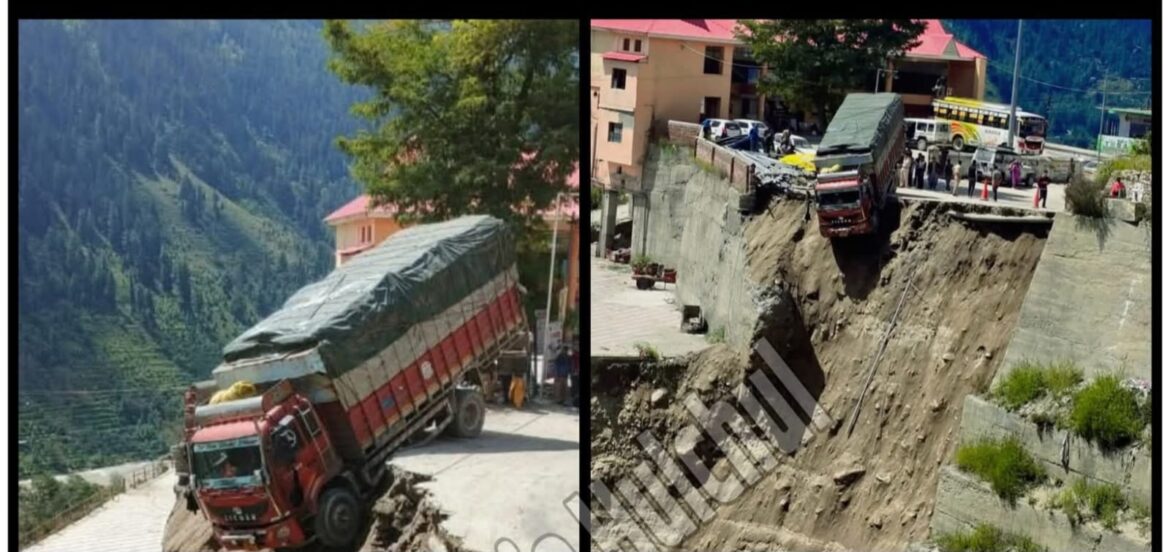 किन्नौर के सांगला बस स्टैंड के पास अचानक सड़क धंस गई, जिससे एक ट्रक हवा में लटक गया।