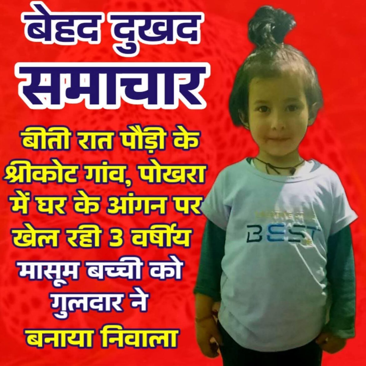 कल रात बहुत ही दुखद घटना विकास खंड श्रीकोट पोखडा ब्लॉक में कल रात 9:30 बजे करीब खाना खा कर ये बच्ची नीचे से ऊपर के माले में सोने जा रही थी अपने घर की नीमदरी में तक जा पहुंची थी तब तक बाघ ने बच्ची पे झपटा मार दिया और उसको घर के नीचे झाड़ी में ले गया उस बाघ ने उस फूल सी बच्ची को निवाला बना दिया श्रीकोट की घटना है जितेन्द्र जी की बेटी थी ।।