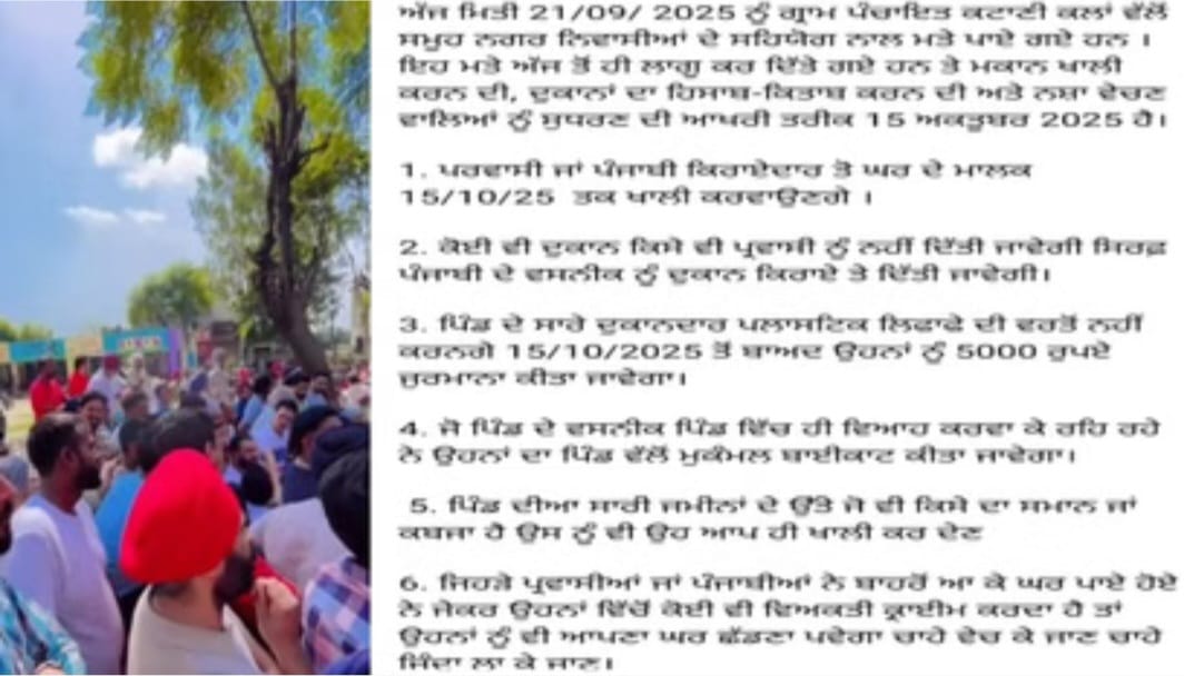 गांव के सरपंच मंजीत सिंह ने बताया कि जिनके मकान गांव में है वह प्रवासी मजदूर यहां रह सकते है। चाहे वह प्रवासी पंजाबी ही क्यों न हो। उन्होंने कहा कि क्राइम लगातार बढ़ रहा है और कई लोग उनकी वेरिफिकेशन नहीं करवाते। गांव की ग्राम सभा द्वारा सात प्वाइंट जारी किए गए है। जिनमें प्रवासी मजदूरों को यहां रहने से मना करने को लेकर है। जिसमें साफ कहा गया है कि कोई भी गांववासी प्रवासी मजदूरों को या फिर प्रवासी पंजाबियों को मकान या फिर दुकान किराए पर न दे। जिन्होंने दे रखी है वह खाली करवाए। गांव में दुकानदार प्लास्टिक के लिफाफे न दे नहीं तो 10 अक्तूबर तक पांच हजार रुपये जुर्माना लगाया जाएगा। जो लोग गांव में शादी करवा रहे हैं उन्हें गांव से बायकॉट किया जाएगा। गांव में किसी ने भी गांव की सरकारी जमीन पर कब्जा कर रखा है वह खुद ही सामान उठवा ले नहीं तो उसका सामान गांव की पंचायत उठाएगी। जो प्रवासी या प्रवासी पंजाबी गांव में पक्का घर लेकर रह रहा है अगर उनकी तरफ से कोई क्राइम किया जाता है तो उन्हें घर छोड़ना पड़ेगा या फिर वह खुद ही घर को ताला लगाकर चला जाए। अगर 15 अक्तूबर तक नशा बिकना बंद न हुआ तो गुरुद्वारा साहिब में उनके नाम स्पीकर कर बोले जाएंगे नहीं तो वह खुद ही सुधर जाएं। इसके साथ साथ यह भी एलान किया गया है कि 26 अक्तूबर को अगला इजलास बुलाया जाएगा ताकि आगे के फैसले लिए जा सके।