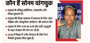 सोनम वांगचुक एक इंजीनियर और पर्यावरणविद हैं। 2009 में आई हिंदी फिल्म 3 इडियट्स में आमिर खान द्वारा निभाए गए किरदार की प्रेरणा उन्ही से ली गई थी। वह लद्दाख के छात्रों के लिए स्कूली शिक्षा प्रणाली में सुधार लाने के लिए भी काम करते रहे हैं। 2018 में, वांगचुक को लद्दाख के लिए शिक्षा में उनके योगदान के लिए रेमन मैग्सेसे पुरस्कार मिला था। वे सतत विकास को भी बढ़ावा देने के लिए जागरुकता फैलाते हैं। 2019 में जब लद्दाख को केंद्र शासित प्रदेश बनाया गया और वहां विधानसभा का प्रावधान नहीं रखा गया, तब से सोनम लद्दाख को छठी अनुसूची में शामिल करने और उसे पूर्ण राज्य का दर्जा देने की मांग कर रहे हैं। इसे लेकर उन्होंने अलग-अलग समय पर धऱना प्रदर्शन और मार्च निकाला है।