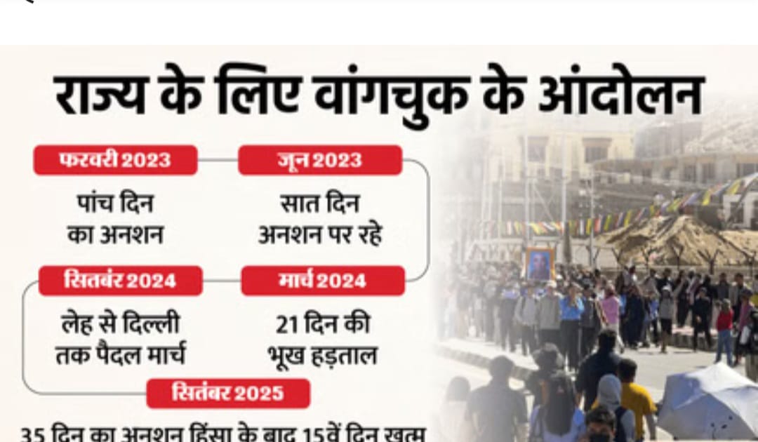 केंद्र शासित प्रदेश लद्दाख के लिए पूर्ण राज्य के दर्जे और छठी अनुसूची में शामिल करने की मांग को लेकर चल रहा आंदोलन बुधवार को हिंसक हो गया। इस हिंसा में चार लोगों की जान चली गई। उपद्रवियों ने लेह स्थित भाजपा कार्यालय को आग लगा दी। हालात पर काबू पाने के लिए अनिश्चितकालीन कर्फ्यू लगाना पड़ा। सरकार ने इस हिंसा के लिए जलवायु कार्यकर्ता सोनम वांगचुक को जिम्मेदार ठहराया। अगले दिन उनके एनजीओ का एफसीआरए लाइसेंस भी रद्द कर दिया गया। लद्दाख के उप-राज्यपाल कविंद्र गुप्ता ने इस सुनियोजित साजिश बताया। इन सबके बीच वांगचुक ने कहा कि इस पूरे मामले में उन्हें बलि का बकरा बनाया जा रहा है।