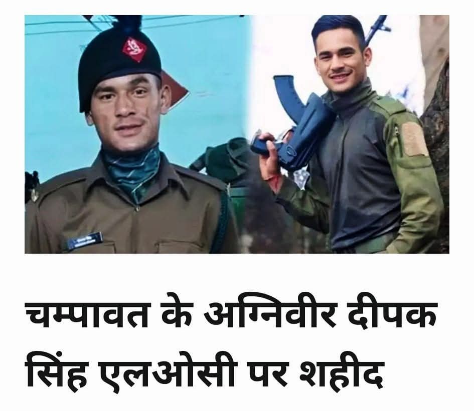भारतीय सेना में अग्निवीर दीपक सिंह जम्मू-कश्मीर के पुंछ में संदिग्ध परिस्थितियों में गोली लगने से शहीद हो गए। 23 साल के दीपक मूल रूप से चंपावत के खरही गांव के रहने वाले थे और 10 दिन पहले ही छुट्टियां खत्म कर ड्यूटी पर लौटे थे।